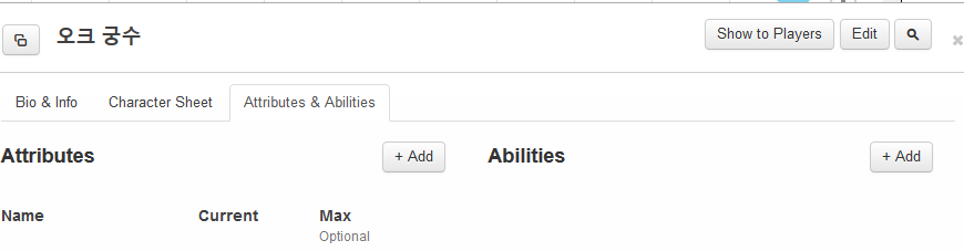 *케릭 저널 상단의 목록 중 attributes(속성) & ablities(능력) 에서 어빌리티 쪽에서 작성 가능합니다