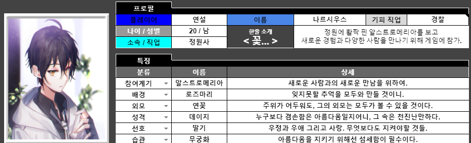 별다른 설정적 제약은 없으며 특징적인 부분을 잡아 자유롭게 제작해주시면 됩니다.