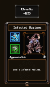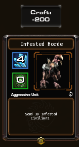 총합 24마리의 감염군단을 보내는 카드 , 감염된시민은 많이 약하지만 , 자폭테란은 35의 넓은 자폭피해를 지니고 있는 카드이고 감염된 마린이 공중 24 , 지상 12의 피해를 지니고있는 좋은 유닛이라 앞에애들이 방어해주고 감염된 마린이 원거리에서 지원사격 (특히 공중유닛잘잡음)해서 라인 관리에 좋아서 그냥 내도 쓸만한 편.