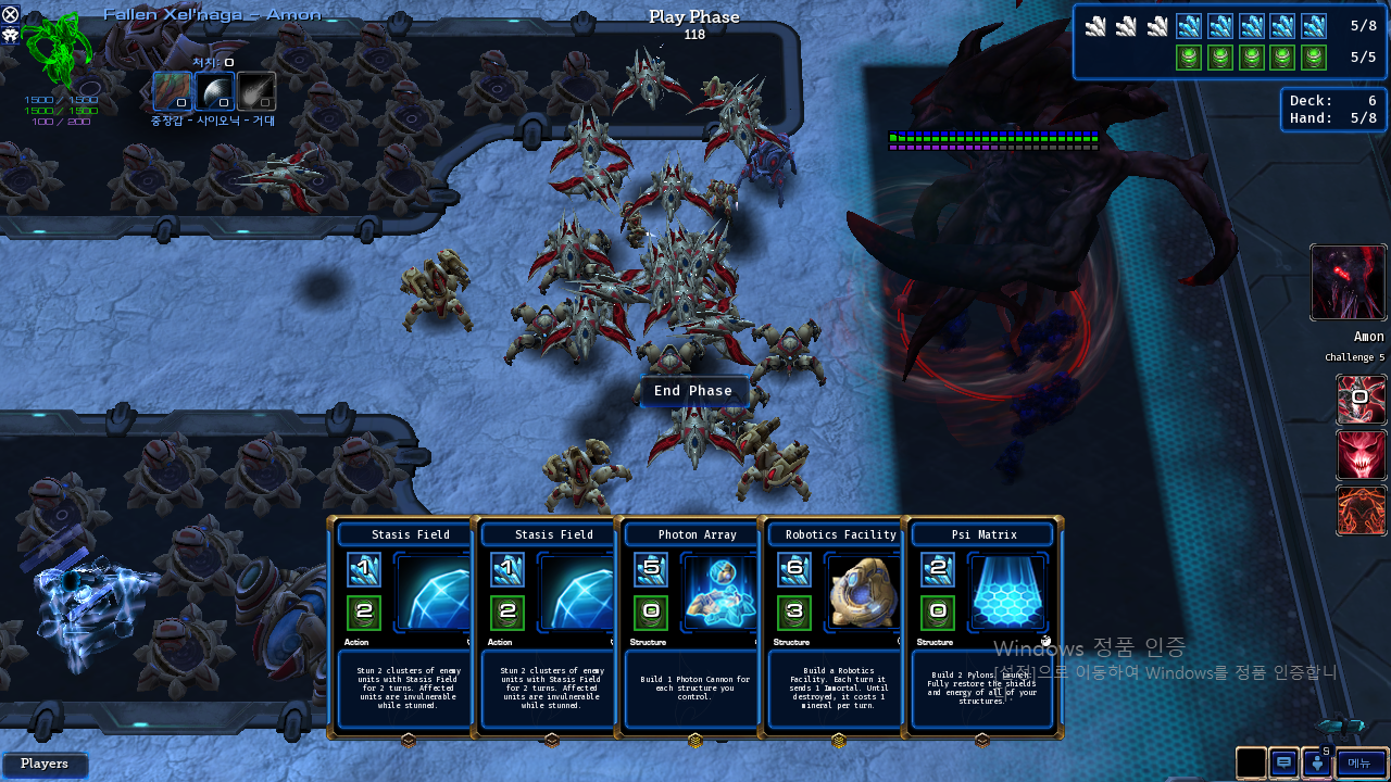 중에 약탈자(어썰트) 였나 하는 친구가 건물을 부수고 튀어나오는게 능력이라(아마 가장 비싼 건물) 감염구덩이를 계속 부숴서 제 4 단계 부터 건물토스로 갈아탔습니다. 딱히 주의할 점도 없이 건물을 계속 지어줘서 상대 진영까지 포토캐논 꽃 밭을 지어주고 생산건물로 유닛을 쌓아놓고 아몬님을 맞이할 준비를 해주면 출근하자마자 퇴근하는 약한 보스입니다.