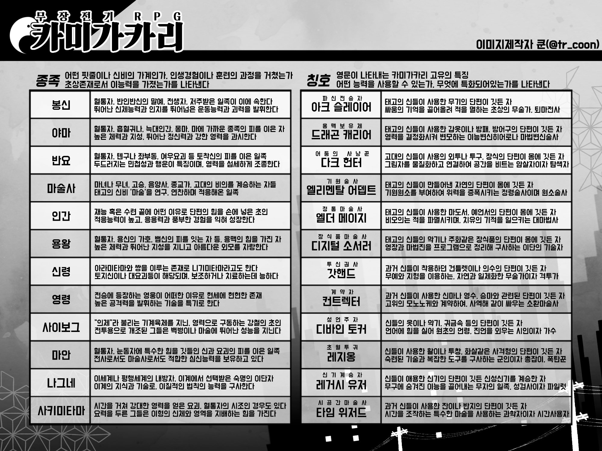 카미가카리에서는 종족 + 칭호(1~2개 선택)를를 조합하여 캐릭터를 만드는데