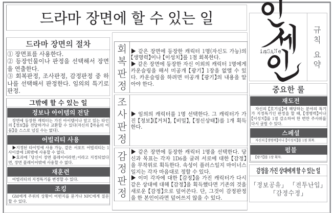 인세인은 괴이나 이상한 현상에 대해 맞선다는 설정. 광기 시스템 등 Coc(크툴루) 룰과 비슷한 요소를 가지고 있습니다.