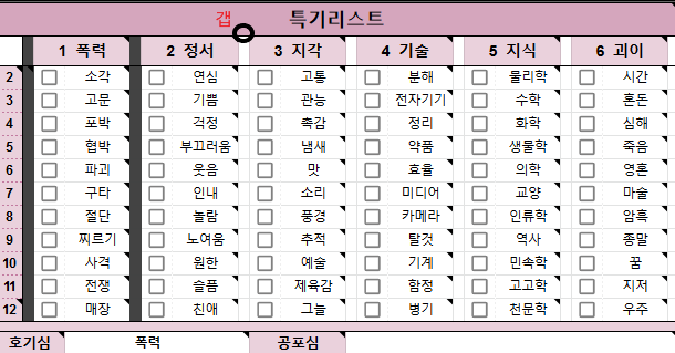 폭력(신체) / 정서(감정) / 지각(감각) /기술 /지식 / 괴이 (선택 시 이성치 1 감소)